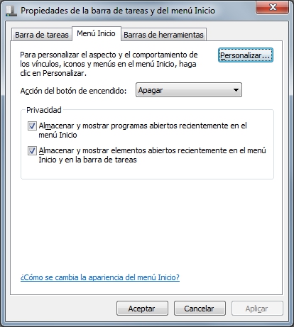 En propiedades y la pestaña de Menú de Inicio.
