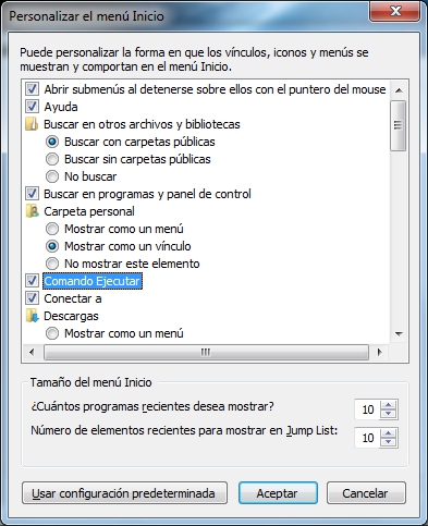 Aceptar, y nos aparecerá en el botón de inicio "Ejecutar".